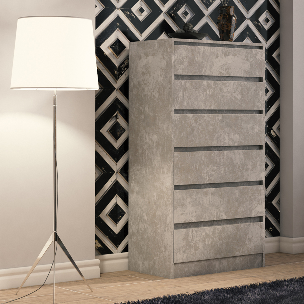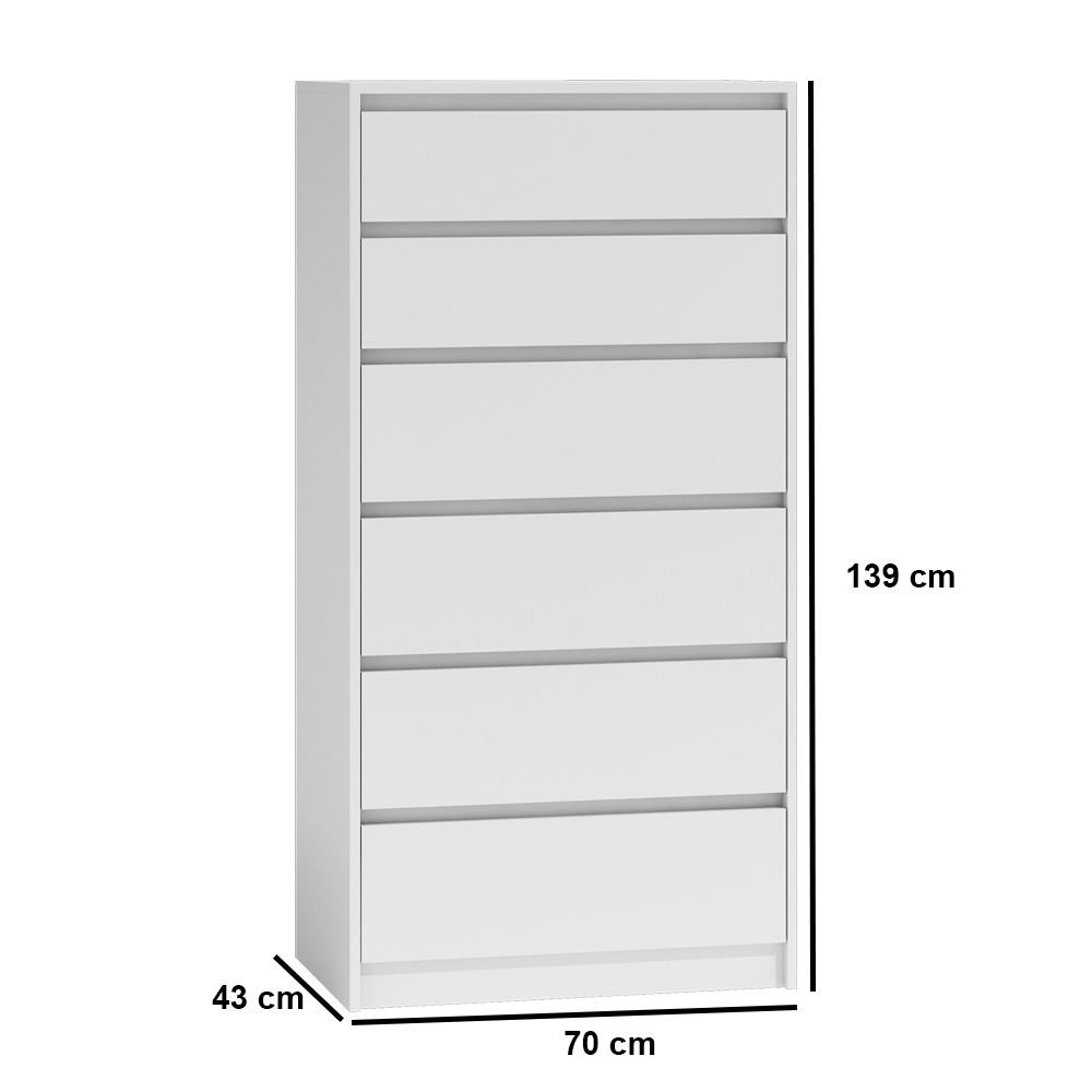 A komód magassága 139 cm, szélessége 70 cm, mélysége 43 cm. Dizájnjában és méreteiben is tökéletesen passzolhat a hálószobába vagy a gardróbba.